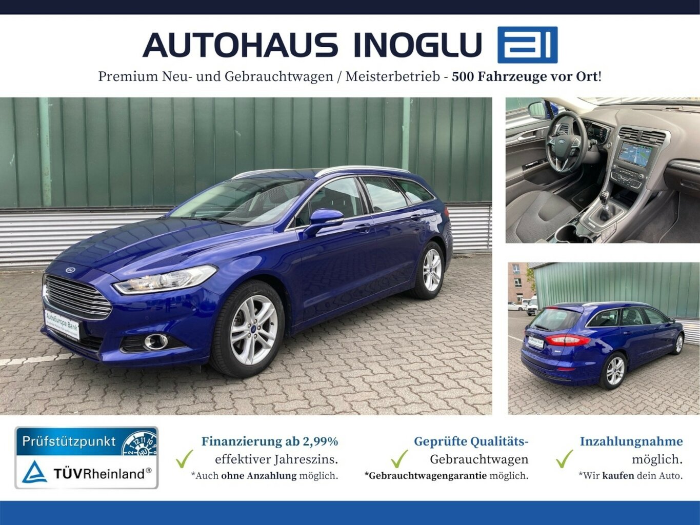 Ford Mondeo 1.5 TDCI Turnier TITANIUM, Getriebe 6-Gang - Typ: B6, Motor 1, 5 Ltr. - 88 kW TDCi KAT, Schadstoffarm nach Abgasnorm Euro 6, Metallic-Lackierung indicblau-metallic, Business-Paket, Winter-Paket, Sicht-Paket, Ford SYNC 3 mit Navigation, Farbdisplay (10, 1 Zoll, Panorama-Schiebedach elektr. mit Solar- ... |