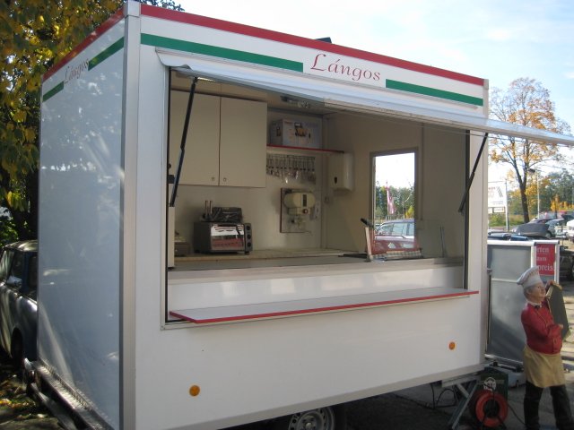 Imbiß Verkaufsanhänger Lángos für Langosch, Mäuschen, Nautzen und Crepes, Quarkbällchen, Pommes Frites, Bratwurst, Buletten, Steak, Getränke, Eis und vieles andere mehr ! Große Gasfriteuse, Hot Dog Macker, Elektro Backofen, 2x Kühlschrank, Profi Gastronomie Kaffeemaschine, Verkaufstheke Front ESG Si ... |