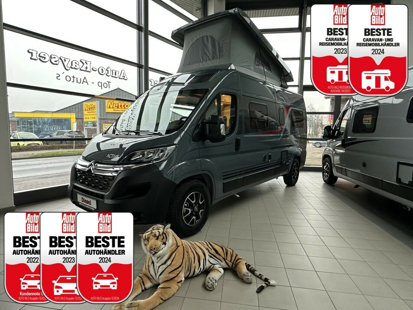 Lackierung Champagner Ixeo, 2te Aufbaubatterie, Fliegengittertüre, Leichtmetallfelgen mit Sommerreifen, Dachfenster hinten und Dachfenster Fahrerhaus, Tempomat Fiat, Motorklimaanlage Fiat, Markise manuell, Radio / CD mit Lautsprecher und Radiovorbereitung, Kaltschaummatratze für Heckdoppelbett, Fahr ... |